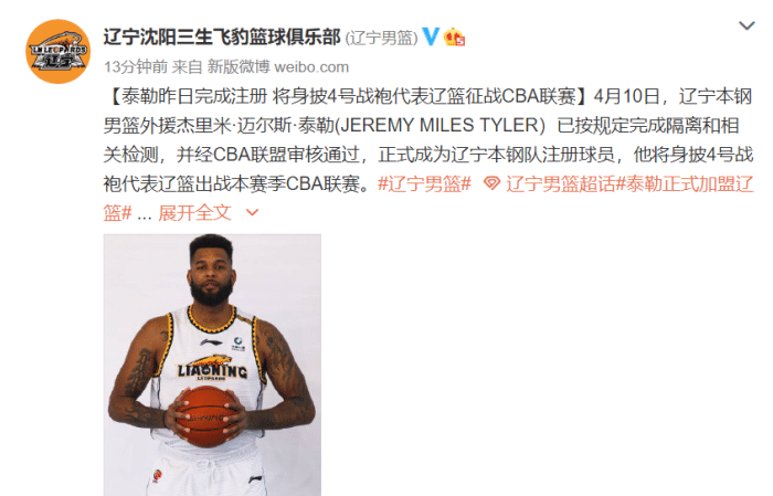 辽宁队官方写道:“4月10日,辽宁本钢男篮外援杰里米·迈尔斯·泰勒(JEREMY MILES TYLER)已按规定完成隔离和相关检测,并经CBA联盟审核通过,正式成为辽宁本钢队注册球员,他将身披4号战袍代表辽篮出战本赛季CBA联赛。”