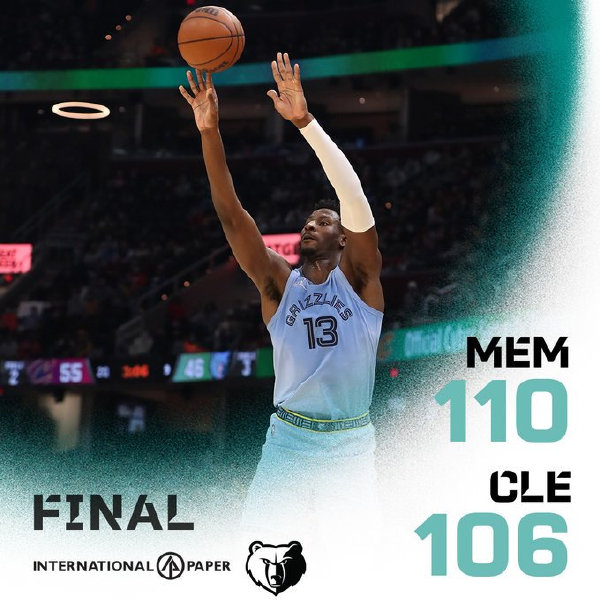 灰熊(25-14):莫兰特26分5篮板6助攻2封盖,小杰克逊22分3篮板,贝恩11分5篮板7助攻,克拉克13分9篮板3封盖,琼斯12分2助攻,亚当斯7分11篮板3助攻,宰伊尔-威廉姆斯10分。