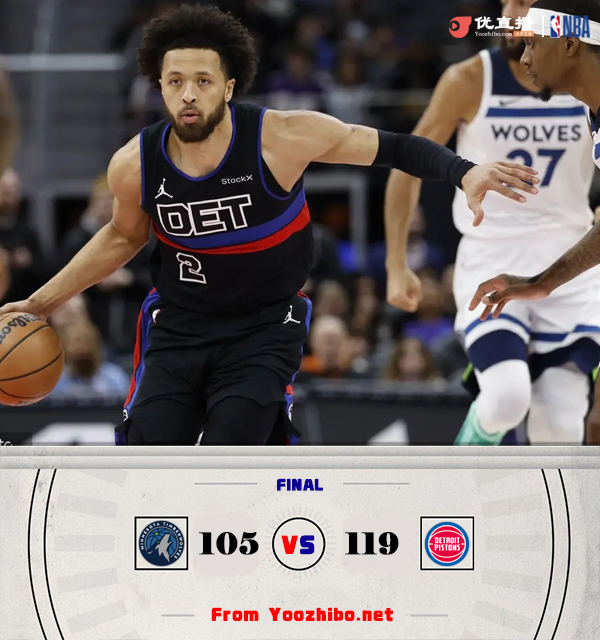 360直播1月5日讯 NBA常规赛,森林狼客场挑战活塞。森林狼17胜16负排西部第十,活塞16胜18负列东部第九。一开场,康宁汉姆得分助攻一肩挑带队占据主动,森林狼内外开花给出回应,次节森林狼命中率骤降,活塞稳扎稳打取得领先,康宁汉姆和爱德华兹展开对飙,半场战罢活塞55-43领先森林狼。下半场,活塞持续发力将分差拉开到20分以上,爱德华兹连中三分苦苦支撑,末节活塞稳扎稳定保持优势,最终,活塞119-105击败森林狼。