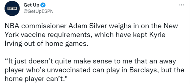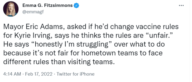 “首先,我认为这条规定不公平,其他城市的运动员可以不接种疫苗来到这儿,而纽约的运动员却必须接种疫苗。这不公平,我不知道是不是波士顿的球迷制定了这条规则(前市长比尔·德布拉西奥是波士顿红袜队球迷)。”他对前市长的调侃,引起一片笑声。