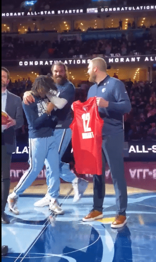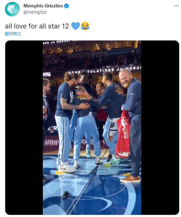 今日赛前,灰熊主帅泰勒-詹金斯正式为莫兰特颁发全明星球衣,莫兰特当着主场球迷的面领取印有12号的全明星战袍,见状,灰熊全队都冲上球场,围着莫兰特疯狂庆祝,灰熊官方发推写道:为莫兰特入选全明星展现所有的爱。