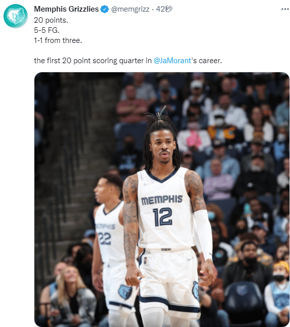 莫兰特单节5中5独砍20分,不过灰熊队打得很被动,上半场一直落后开拓者;不算与开拓者这场比赛,灰熊6连胜41胜18负排在西部第三,即使今天输球仍旧排名西部前三。