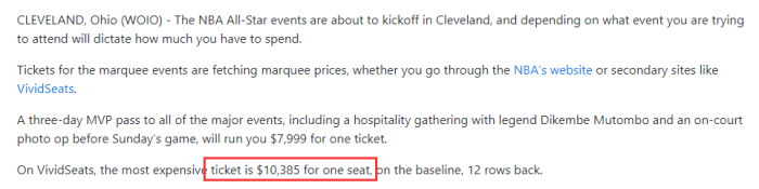 360直播02月16日讯 ,据克利夫兰当地媒体cleveland19.com报道,本赛季全明星正赛的最高票价已超过10000美元,其他各阶段赛事的最低票价也曝光了。