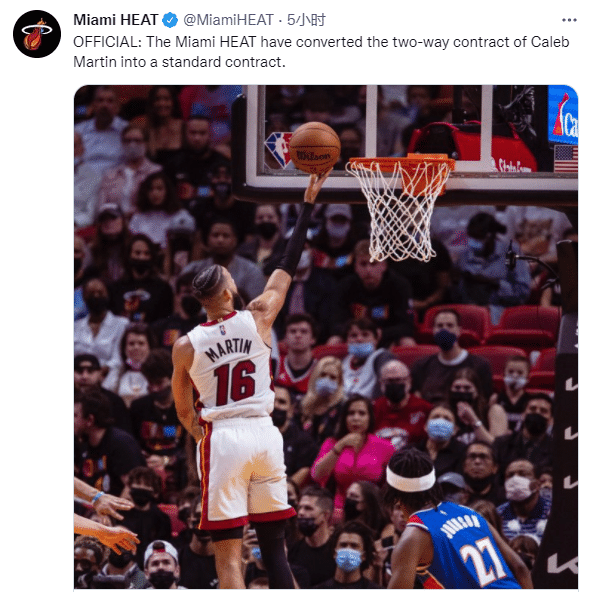 热火官方正式宣布,把科雷布-马丁的双向合同转为NBA的正式合同,至赛季结束;本赛季科雷布-马丁为热火队出战44场(其中首发10场),场均可以得到9.5分4篮板1助攻1抢断,凭借出色的表现赢得正式合同。