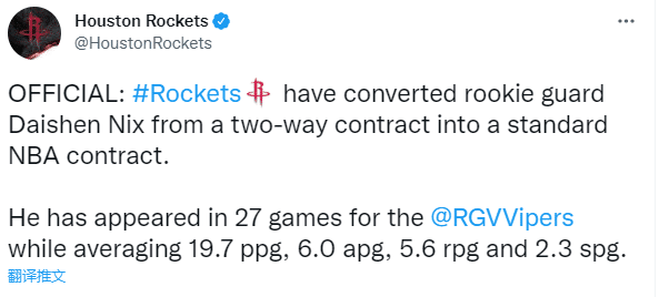 火箭官方消息,球队将新秀球员戴申-尼克斯的双向合同转为了一份标准的NBA合同;本赛季尼克斯为火箭出战过8场,场均得到3.8分1.3篮板1.3助攻。