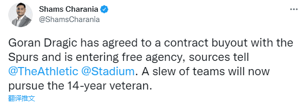 据名记Shams报道,马刺已经和德拉季奇达成买断协议,这也意味着德拉季奇将进入自由球员市场,有一些球队想要追求这位14年老将