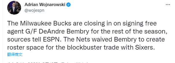据名记沃纳罗斯基报道,雄鹿接近与自由球员本布里签约至本赛季结束,在此前篮网和76人大交易中,为了给哈登和西蒙斯的交易腾出球员名额,篮网裁掉了本布里。