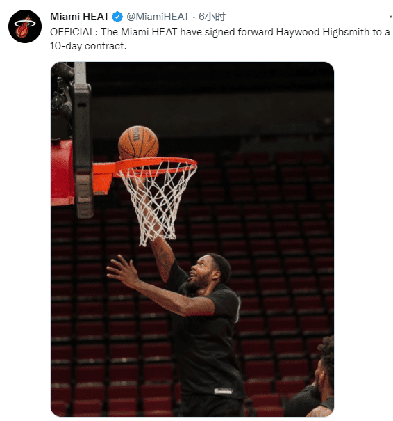 热火官方宣布与前锋海伍德-海史密斯签订了一份10天合同;25岁海史密斯本赛季为热火出战了4场比赛,场均得到3分1.3篮板,三分命中率为57.1%。