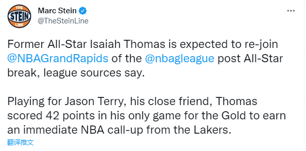 据名记Marc Stein报道,小托马斯预计将在全明星赛后加盟掘金下属发展联盟球队大急流金块队;大急流金块队的主帅是小托马斯好友杰森-特里,此前他曾为该队出战一场,首秀轰下42分8助攻6篮板,然后和湖人签下短合同。