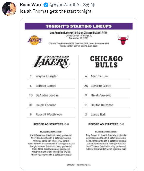 360直播12月20日讯 ,NBA常规赛湖人大战公牛,由于队内多达8名球员缺席比赛,湖人再次变阵,全新的首发五虎是詹姆斯、威少、艾灵顿、小乔丹和小托马斯,32岁小刺客一战证明自己,联手詹皇威少两大巨头首发出战,湖人本赛季第一次使用这套首发,也是赛季第16套首发。