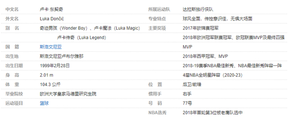 卢卡-东契奇(Luka Dončić),1999年2月28日出生于斯洛文尼亚卢布尔雅那,斯洛文尼亚职业篮球运动员,司职后卫/前锋,效力于NBA达拉斯独行侠队。卢卡-东契奇的职业生涯开始于西班牙篮球甲级联赛皇家马德里篮球俱乐部。2018年NBA选秀,卢卡-东契奇在首轮第3顺位被亚特兰大老鹰队选中,随后被交易至达拉斯独行侠队。