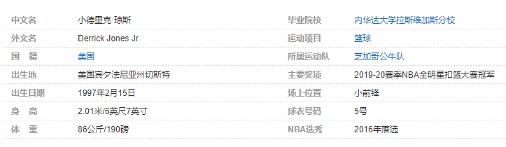 小德里克-琼斯(Derrick Jones Jr.),1997年2月15日出生于美国宾夕法尼亚州切斯特(Chester, PA),美国职业篮球运动员,司职小前锋,效力于NBA芝加哥公牛队。