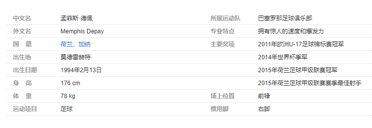 孟菲斯·德佩(Memphis Depay),1994年2月13日出生于荷兰莫德雷赫特,荷兰足球运动员,拥有荷兰和加纳双重国籍,荷兰足球运动员,场上司职前锋,现效力于西班牙足球甲级联赛的巴塞罗那足球俱乐部。