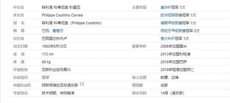 菲利佩·科蒂尼奥(Philippe Coutinho),全名菲利佩·科蒂尼奥·科雷亚(Philippe Coutinho Correia),1992年6月12日出生于巴西里约热内卢,巴西足球运动员,场上司职前腰,亦可胜任边锋。现效力于英格兰的阿斯顿维拉足球俱乐部。