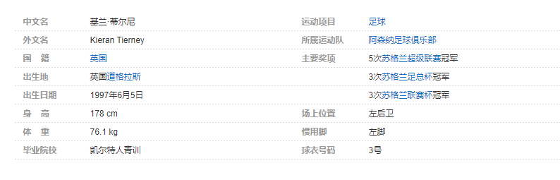 基兰·蒂尔尼(Kieran Tierney),1997年6月5日出生于英国道格拉斯,苏格兰足球运动员,场上司职左后卫,效力于英超联赛的阿森纳足球俱乐部。