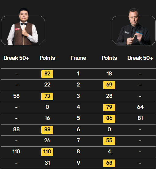 第九局:决胜局中,伯顿在丁俊晖开球后留下机会的情况下,连续上手并最终以68:31锁定胜局,以5-4的总比分击败丁俊晖。
