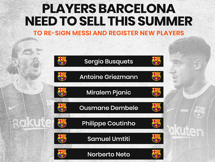 根据外媒《90min》的报道显示,为了续约梅西和注册新援,巴萨需要卖掉这些球员,其中不乏有格列兹曼、皮亚尼奇、登贝莱和库蒂尼奥等八名球员。