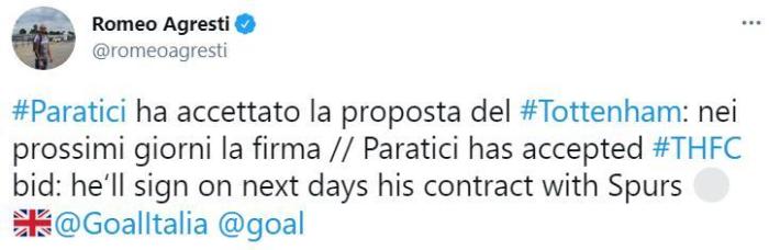 帕拉蒂奇接受了热刺的报价,将在未来几天内与热刺签约。