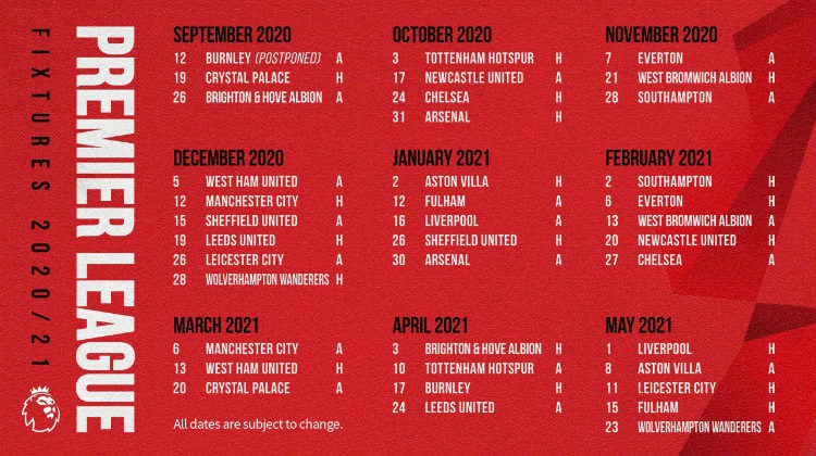 20/21赛季曼联赛程表出炉:首轮9月12号客场挑战伯恩利