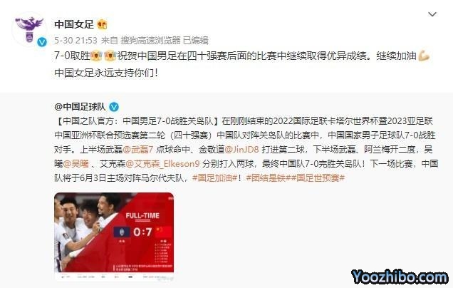 中国女足官微写道:“7-0取胜!祝贺中国男足在四十强赛后面的比赛中继续取得优异成绩。继续加油