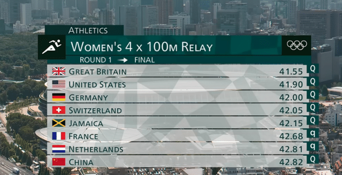 100米接力的比赛,中国女队先出战预赛,在第二小组出战,梁小静、葛曼棋、黄桂芬和韦永丽一起出场,这个小组的竞争也很激烈,中国队整体的交接还是比较顺畅,最后一棒韦永丽压制尼日利亚,拿到了小组第三,直接进入决赛。在进入决赛的8支队伍里,中国队42秒82排名第八位,当然这只是预赛成绩,决赛中国队还是有机会冲击更好成绩。这是中国女子接力队时隔21年再进决赛,上次决赛还是2000年悉尼奥运会。