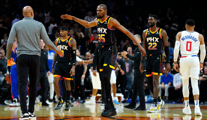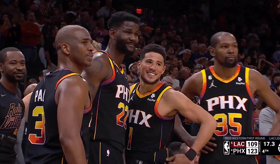 360直播讯04月19日NBA季后赛西部首轮,太阳123-109战胜快船,系列赛大比分扳成1-1平,接下来将奔赴洛杉矶进行两场比赛。此役双方打得一波三折,快船第二节一度领先13分,布克和杜兰特爆发,半场前扳平比分。第三节的布克单节轰下18分,率队领先,莱昂纳德和威少紧咬比分差距。最后时刻快船连续失误,保罗接管了比赛,太阳成功拿下胜利。快船的莱昂纳德31分8篮板7助攻3抢断、威少28分5篮板5助攻。太阳的四巨头杜兰特25分6篮板5助攻、艾顿14分13篮板、布克38分9助攻、保罗16分4篮板8助攻。