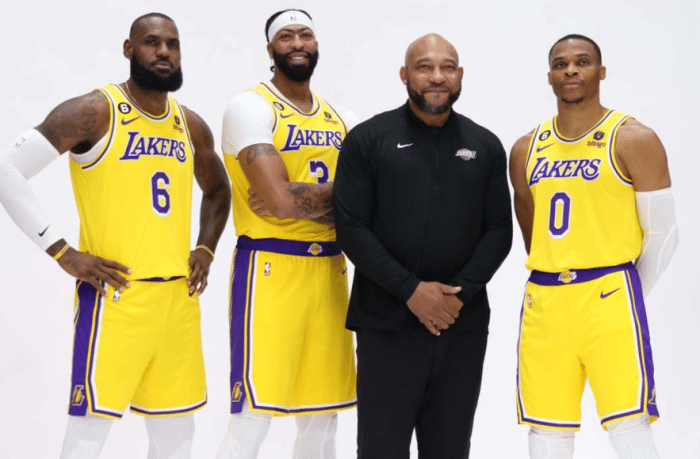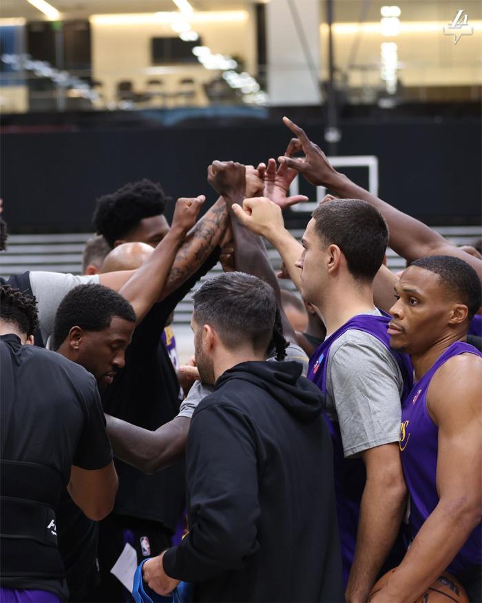 360直播09月28日,洛杉矶湖人队正式举办训练营,首日训练之后湖人官方晒出训练照,配文写道:训练营第一天;浓眉单挑詹姆斯,两大巨头的表情抢镜;威少抱球目视远方,加布里埃尔满脸笑容,训练之后众球员围在一起击拳加油。