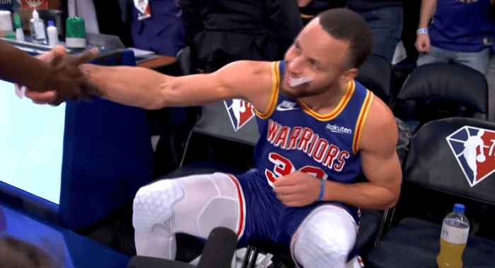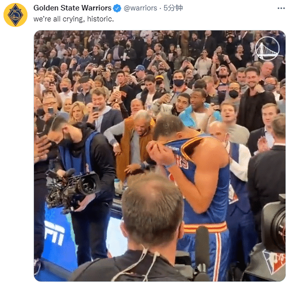 库里还深情拥抱自己的母亲,此时库里貌似激动地哭了,喜极而泣难掩喜悦之情;之后库里坐回替补席,并且再次和格林拥抱庆祝,库里用球衣擦拭眼泪,他真的哭了,勇士官方写道:我们都哭了,历史性一刻。