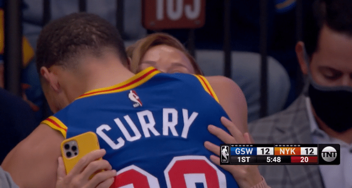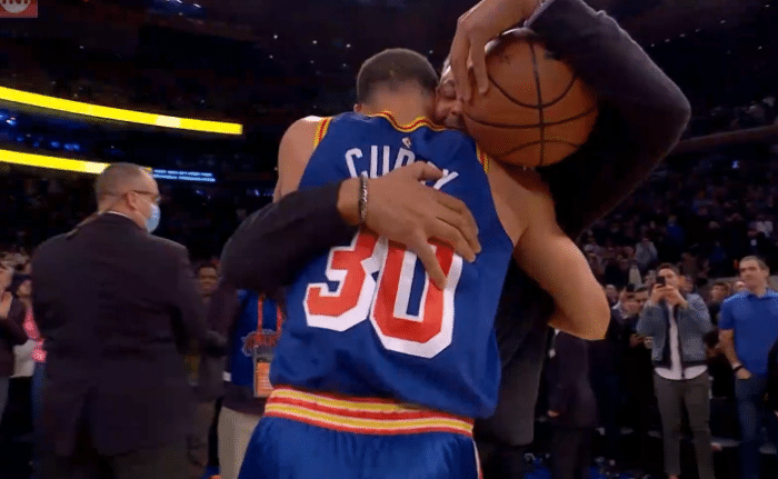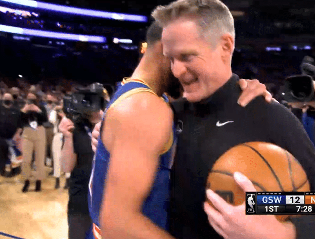 维金斯助攻库里投进破纪录的三分球,正式加冕历史三分王之后,库里和格林等队友击掌以及拥抱庆祝,麦迪逊花园球馆现场近2万人集体为库里欢呼呐喊,科尔亲自把本场比赛的用球送给库里,之后库里紧紧拥抱自己的父亲,并且把球给戴尔-库里。