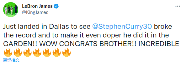 库里破纪录冲上推特热搜引热议,湖人当家球星詹姆斯发推恭喜库里,配文:刚降落在达拉斯,看到库里打破了记录,太让人兴奋了,他在麦迪逊花园球馆做到了!哇恭喜兄弟!太不可思议了。(7个火的表情)