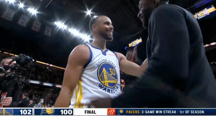 360直播12月14日讯 ,勇士102-100险胜步行者,库里全场出战35分钟20投8中、三分15中5拿到26分6篮板6助攻1盖帽1抢断,整体三分手感不佳,但关键时刻连得5分,客场球迷集体为他起立欢呼;赢球后,库里露出笑容,并且拥抱对手。