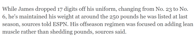 360直播9月24日讯 ,湖人总经理佩林卡表示詹姆斯有所减重,而ESPN随后跟进报道称,所谓的“减重”其实是增肌。詹姆斯目前的体重还和上赛季差不多,都是250磅(约113公斤)左右,据悉他的休赛期计划更多是增添纤细的肌肉,而不是单纯的减少体重。
