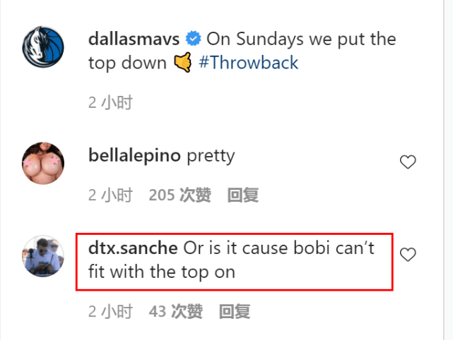 有球迷调侃道:“是不是车篷没拿掉,博班就进不来啊?”从博班的身材来看,恐怕事实的确如此。博班身高2米24,坐在东契奇身边,让这位联盟新星看上去相当瘦小。