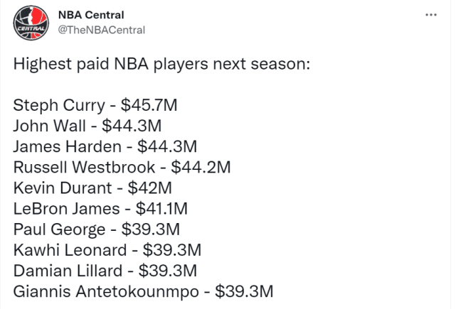 360直播讯 北京时间8月13日,美媒NBA Central列出了2021-22赛季年薪排名前十的球星,库里4570万美元高居榜首,而沃尔和哈登并列第二。