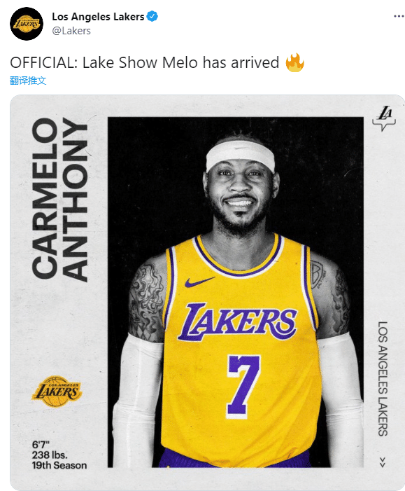 360直播讯 北京时间8月7日,洛杉矶湖人官宣,正式签约安东尼,晒出甜瓜身穿7号球衣照,并且发推:湖人秀安东尼已经来到洛杉矶;湖人还正式签约阿里扎、霍华德、纳恩、艾灵顿以及贝兹莫尔等球员。