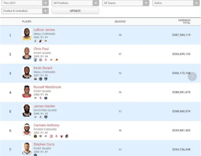 算上太阳4年1.2亿的续约合同,保罗生涯已狂赚4.5亿,这一个数额让保罗成为了NBA历史球员总薪资榜的第二名,历史只比詹姆斯少。当前,詹姆斯已赚到3.87亿美金,与湖人提前续约2年8500万,詹姆斯排在历史总薪资榜第一名,保罗已赚到3.26亿美金,杜兰特已赚到3.06亿排在第三名。