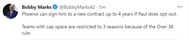 薪金专家鲍比-马克斯跟进报道,保罗跳出合同后,太阳可以和他签一份最长4年的合同。拥有薪金空间的球队最多只能签3年,受限于38岁规则。此前有报道称,保罗的目标可能是签下一份3年9000万美元左右的新合同。