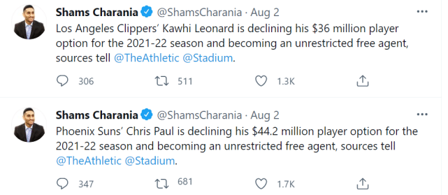 360直播讯 北京时间8月2日,据名记查拉尼亚道,太阳球星保罗和快船球星莱昂纳德都计划拒绝执行下赛季的球员选项,他俩都将成为不受限制的自由球员。保罗下赛季的年薪是4420万美元,小卡下赛季的年薪是3600万美元,两人都有望重新签下一份多年合同。