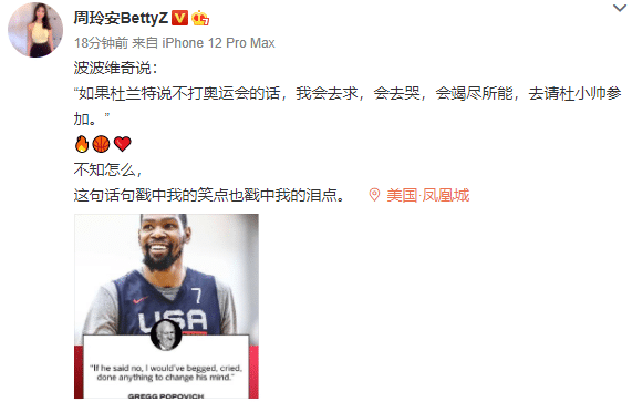 美国男篮主帅波波维奇在接受的时候表示:“如果杜兰特说不参加奥运会的话,我会去求,会去哭,会竭尽所能,去请杜兰特参加这次的奥运会。”