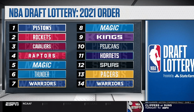 360直播讯 6月23日,NBA选秀大会乐透抽签举行,最终活塞拿下状元签,而常规赛倒数第一的火箭拿下榜眼,骑士探花签位,猛龙等队分居后面。值得一提的是森林狼获得第7顺位,在此前交易中已经给到了勇士,所以勇士获得了第7和第14两个签位。