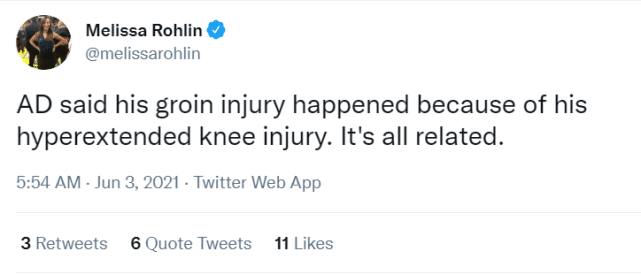 谈到腹股沟的伤病时,浓眉说:“第四场比赛的腹股沟伤势,是由于第三场比赛左膝过度伸展造成的。”换句话说,这是伤病的连锁反应。