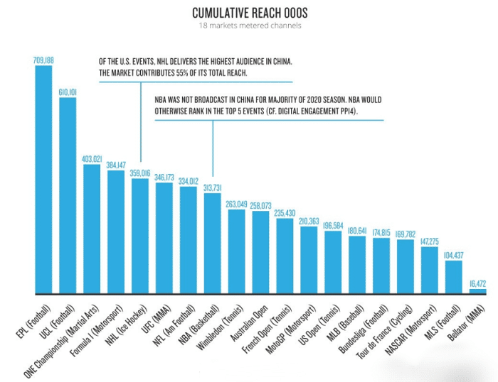 格斗赛制很抢镜,MMA已经超越篮球、网球等运动,在收视率层面成为了世界第二大运动。其中的代表是ONE冠军赛仅次于英超和欧冠,UFC的收视率比NBA还要高,Bellator也进入世界二十大体育赛事行列,上升势头明显。