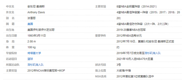 安东尼-戴维斯(Anthony Davis),1993年3月11日出生于美国伊利诺伊州芝加哥(Chicago, Illinois),美国职业篮球运动员,司职大前锋/中锋,效力于NBA洛杉矶湖人队。2012年NBA选秀,安东尼-戴维斯以选秀状元身份被新奥尔良黄蜂队(现新奥尔良鹈鹕队)选中,从而进入NBA,职业生涯先后效力于黄蜂(鹈鹕)队以及湖人队。