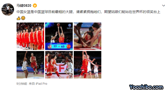 中国女篮对阵美国队虽然没有取得胜利,但整体的表现赢得了外界一致的肯定,其中包括马健,他在社交媒体上表示:“中国女篮是中国篮球目前最粗的大腿,请紧紧拥抱她们,期望姑娘们能站在世界杯的领奖台上。”