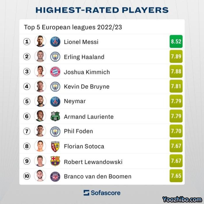 360直播10月18日消息,数据网站Sofascore更新了2022-23赛季欧洲五大联赛球员评分排行榜,梅西以8.52分列第一,哈兰德第二。