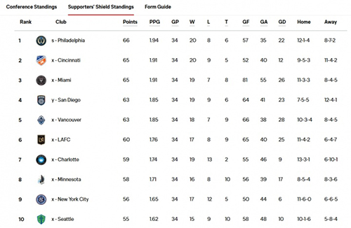 美职联积分榜,费城联合66分夺得常规赛冠军,辛辛那提与迈阿密国际同积65分,迈阿密因胜场少排第三。