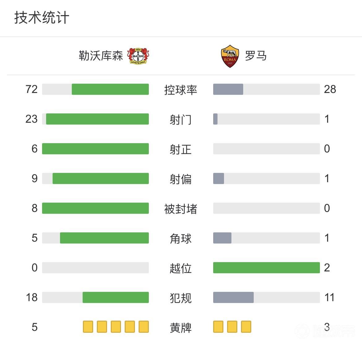 最终罗马客场零射正0-0战平勒沃库森,总比分罗马1-0淘汰药厂进军决赛。