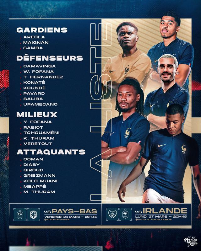 360直播03月16日讯 ,法国国家队公布了最新一期国家队大名单。姆巴佩、吉鲁、格列兹曼等球星领衔,迈尼昂、迪亚比、穆阿尼在列,卡马文加以后卫身份入选。