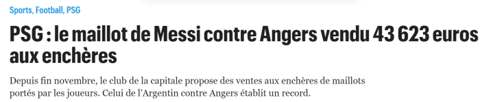 该媒体表示,梅西在夺得世界杯冠军后回到巴黎所参加的首场比赛是巴黎2-0昂热的法甲联赛,当时梅西还打进一球。当地时间周日,在巴黎俱乐部的拍卖会上,一位来自中国的买家以43623欧元的价格将这件球衣拍走。