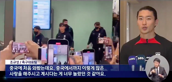 昨天,韩国男足抵达深圳机场时,受到了大批中国球迷的热情接机,对此曹圭成也颇感意外:“这是我第一次来到中国,在中国我们也收到了很多爱,也让我感到很惊讶。因为我以为客场作战,总是难逃被对方球迷狂嘘,所以我对于中国球迷的热情欢迎有些意外!当然,我知道大多数中国球迷都不是冲着我来的,很多人拿着孙兴慜哥的球衣,还有李刚仁的球衣。”